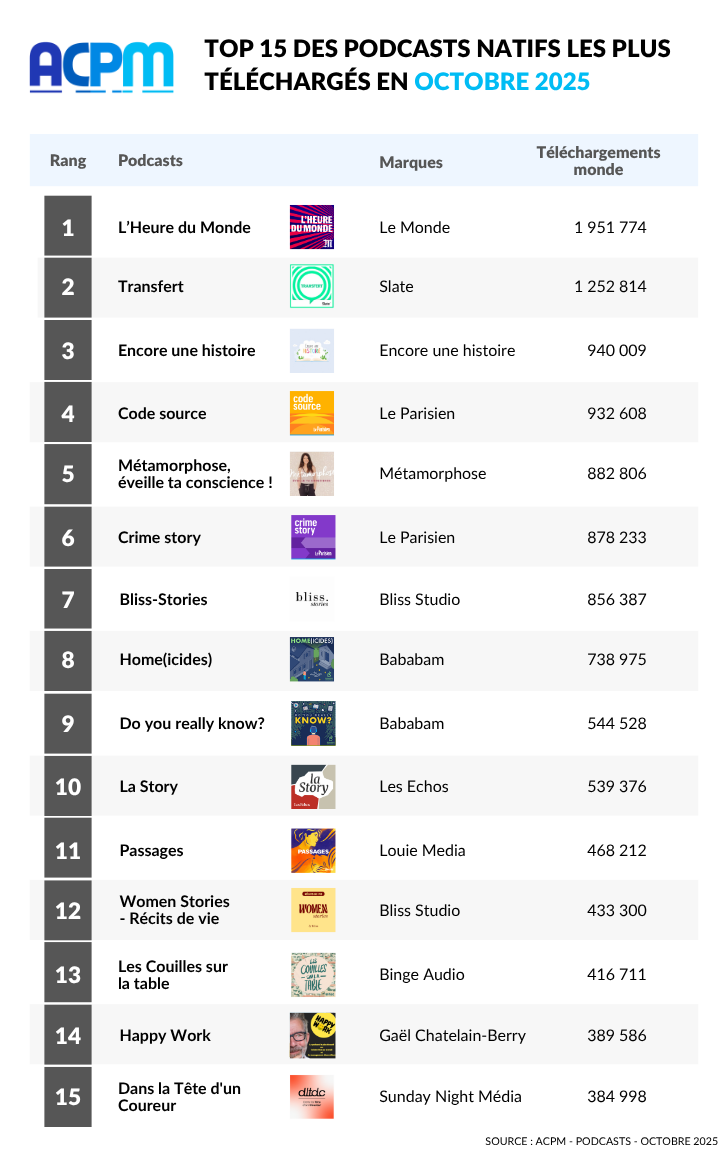 Ce mois-ci, l'ACPM accueille dans son classement 10 podcasts, dont La Matinale de la nuit de Radio Nova, Les Histoires Cultes par Encore une histoire, Nocturne de Louie Media, La Légende des chevaliers de la table ronde de l'INA, Les disparus de la gare de Perpignan et Le Canal de Perpignan de l'Indépendant, Nostalgie Génération Dorothée de Nostalgie, Le Salon Fantôme de Binge Audio & Ca Roule Quentin de La Provence.